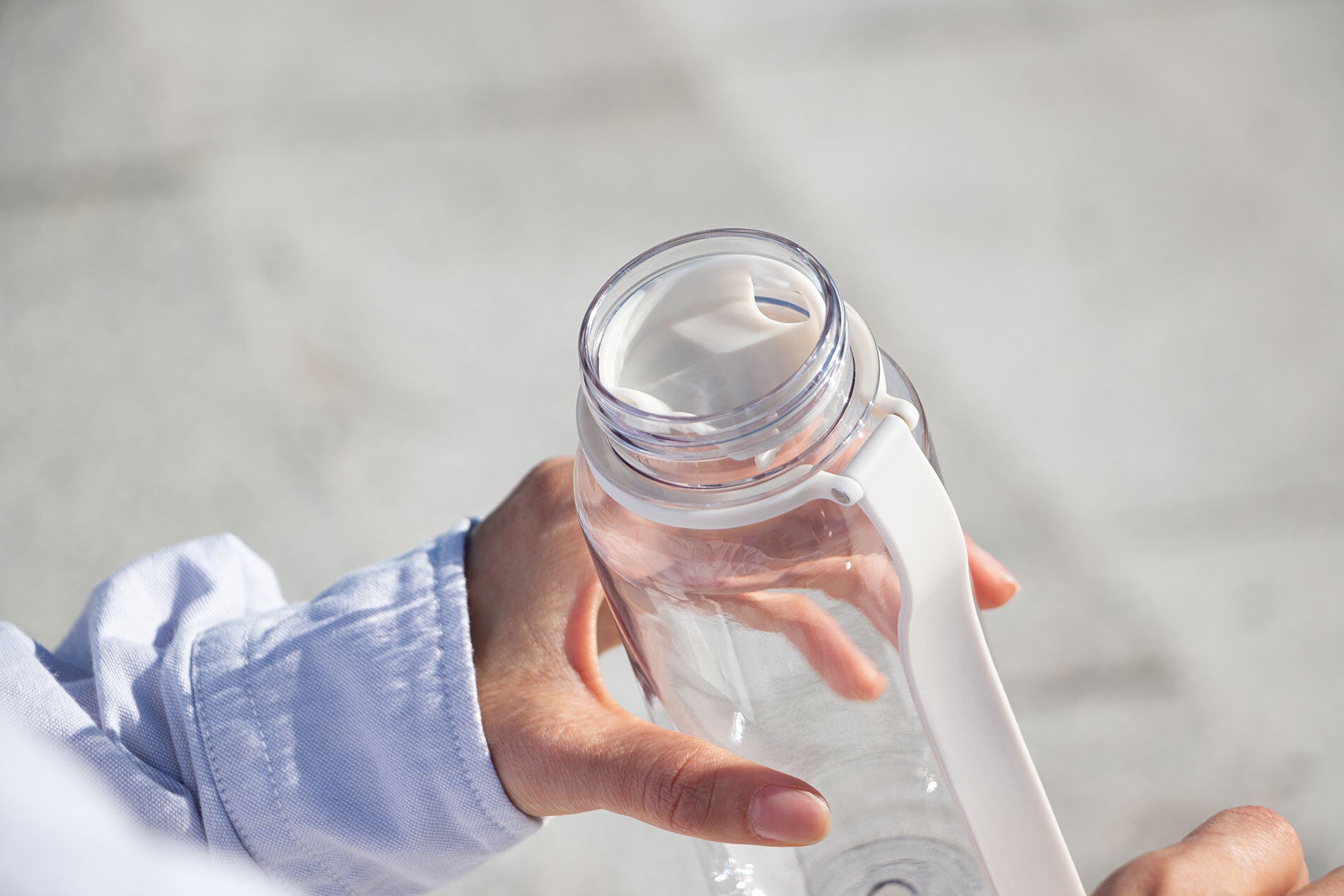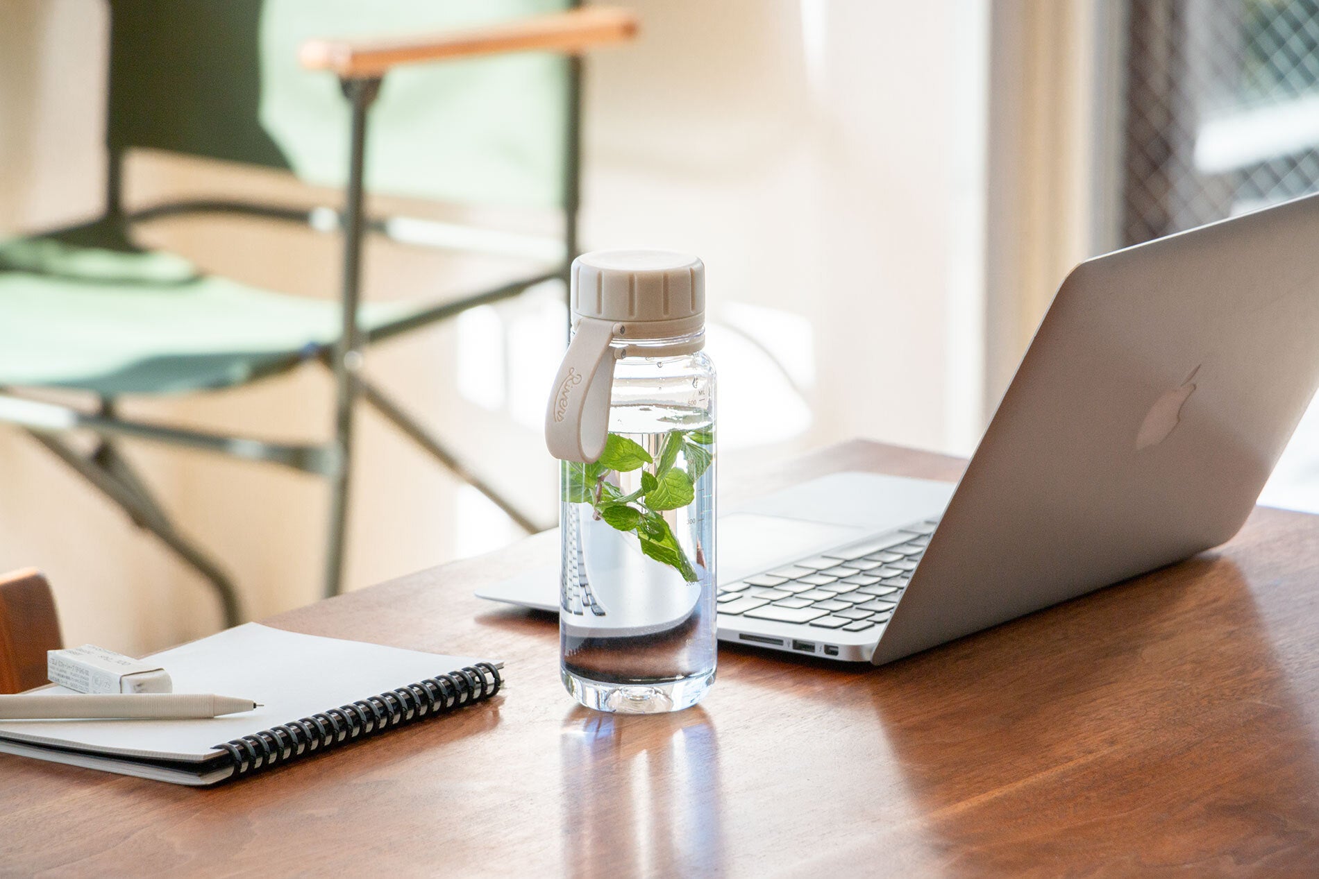 蓋を紛失する心配のないシリコーンストラップは、持ち運びの際のハンドルやカラビナを装着にも使えます。目盛り付きのため残量確認はもちろん、調理時の計量にも便利。口をつけた時に水が勢いよく飛び出さないように、中フタも付属します。